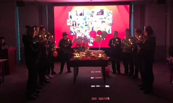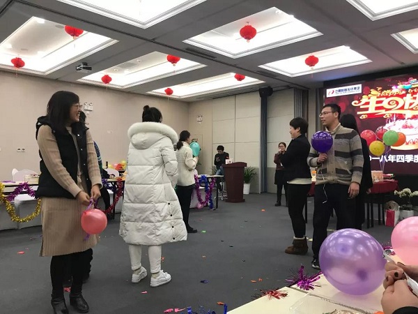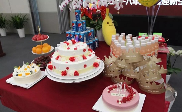 会场悬挂拉花,并以五彩斑斓的气球作为点缀,除此之外,工会同事还准备了多种水果、饮料、生日蛋糕以及小礼品送给各位寿星与新人。别具一格的布置创意增加了喜庆的气氛,便于寿星们和新人们交流感情以及完成游戏。
