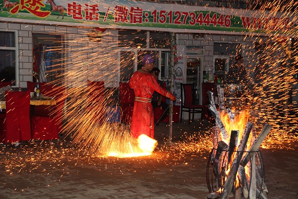 傍晚时分,品尝完农庄美味的佳肴,大家一起手拉手围绕着冉冉篝火,唱起让人心醉的蒙古歌,跳起优美的安代舞,欣赏着火星四溅的打铁花,载歌载舞,放飞心情。